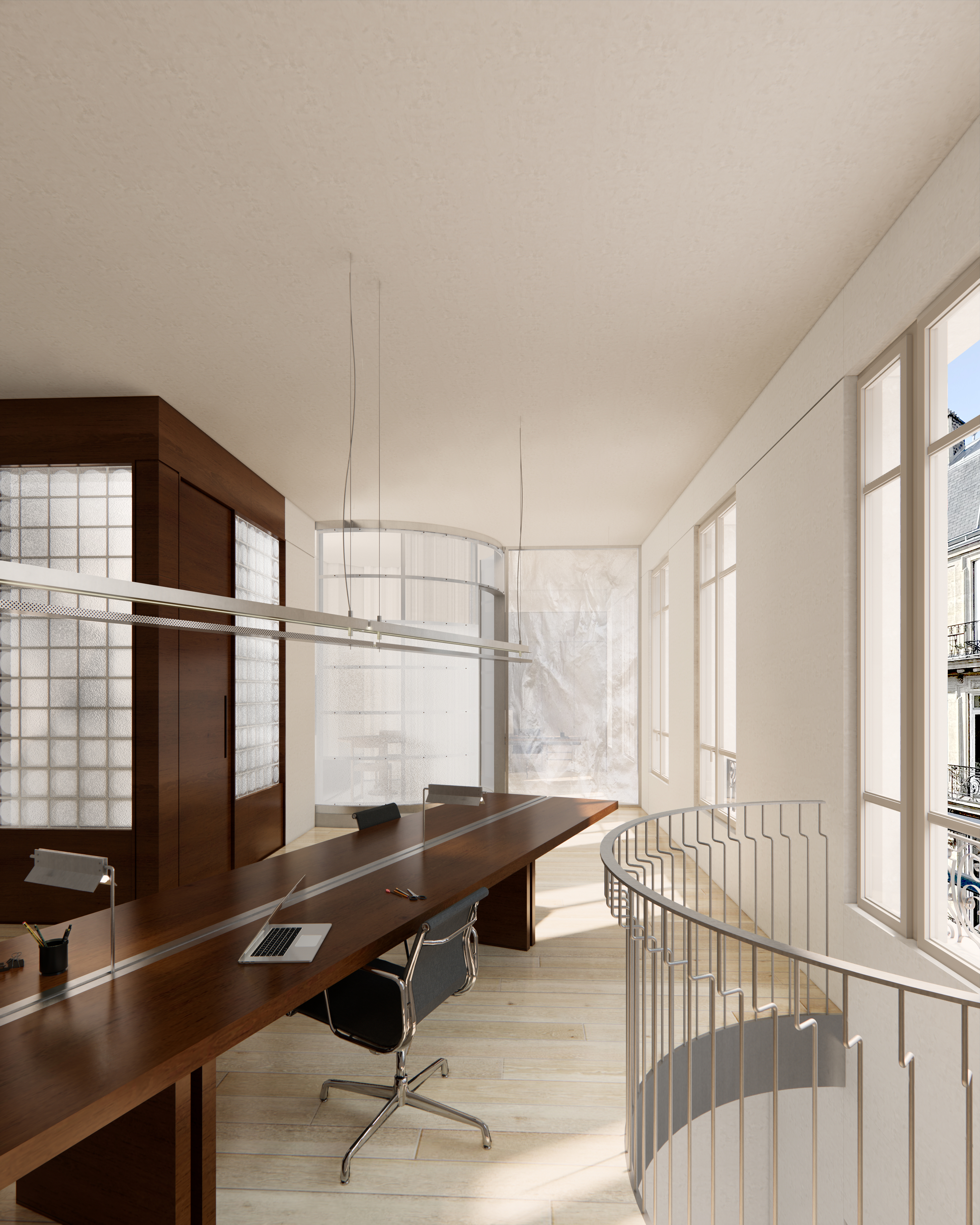 Guidés par cette envie d’offrir un maximum de lumière naturelle et de grands espaces, nous avons imaginé un projet qui manipule les codes de l’immeuble bourgeois que nous connaissons tous. Ainsi nous pouvons rêver trouver un jour ici de magnifiques doubles-hauteurs, des enfilades de fenêtres libres de toute cloison, de créer un parcours clair et ponctué de mobilier pensé pour le lieu et devenant indissociable.