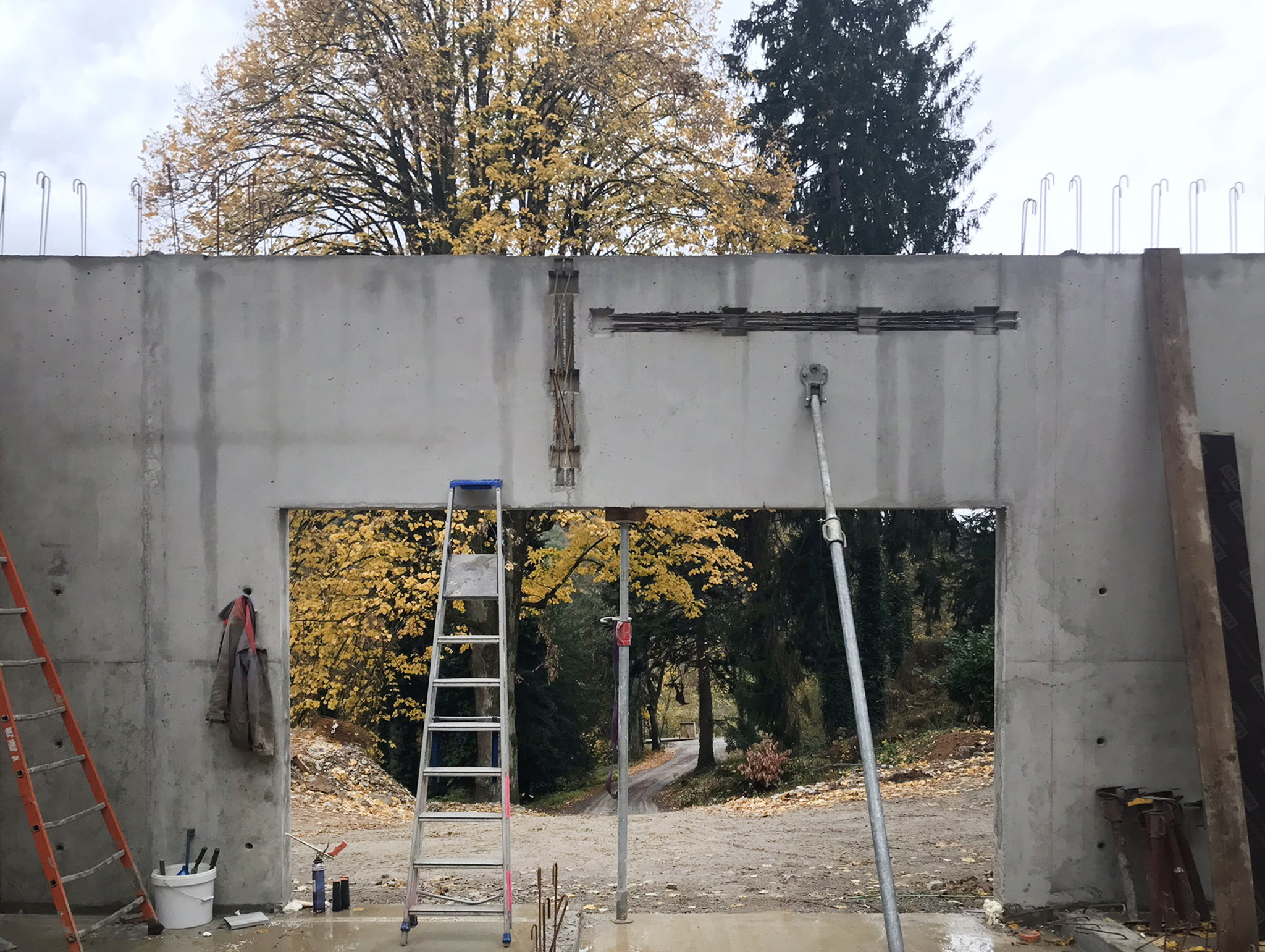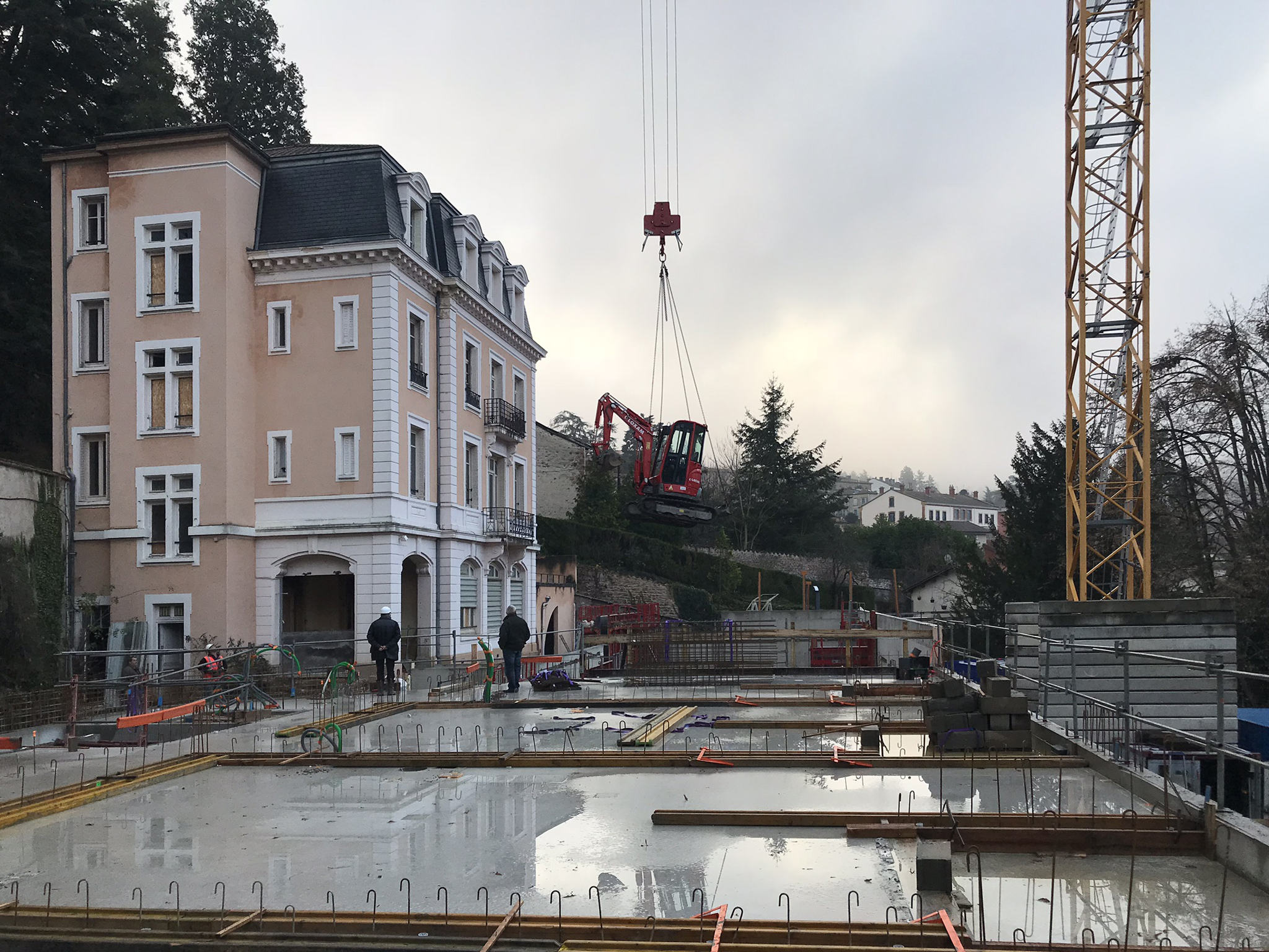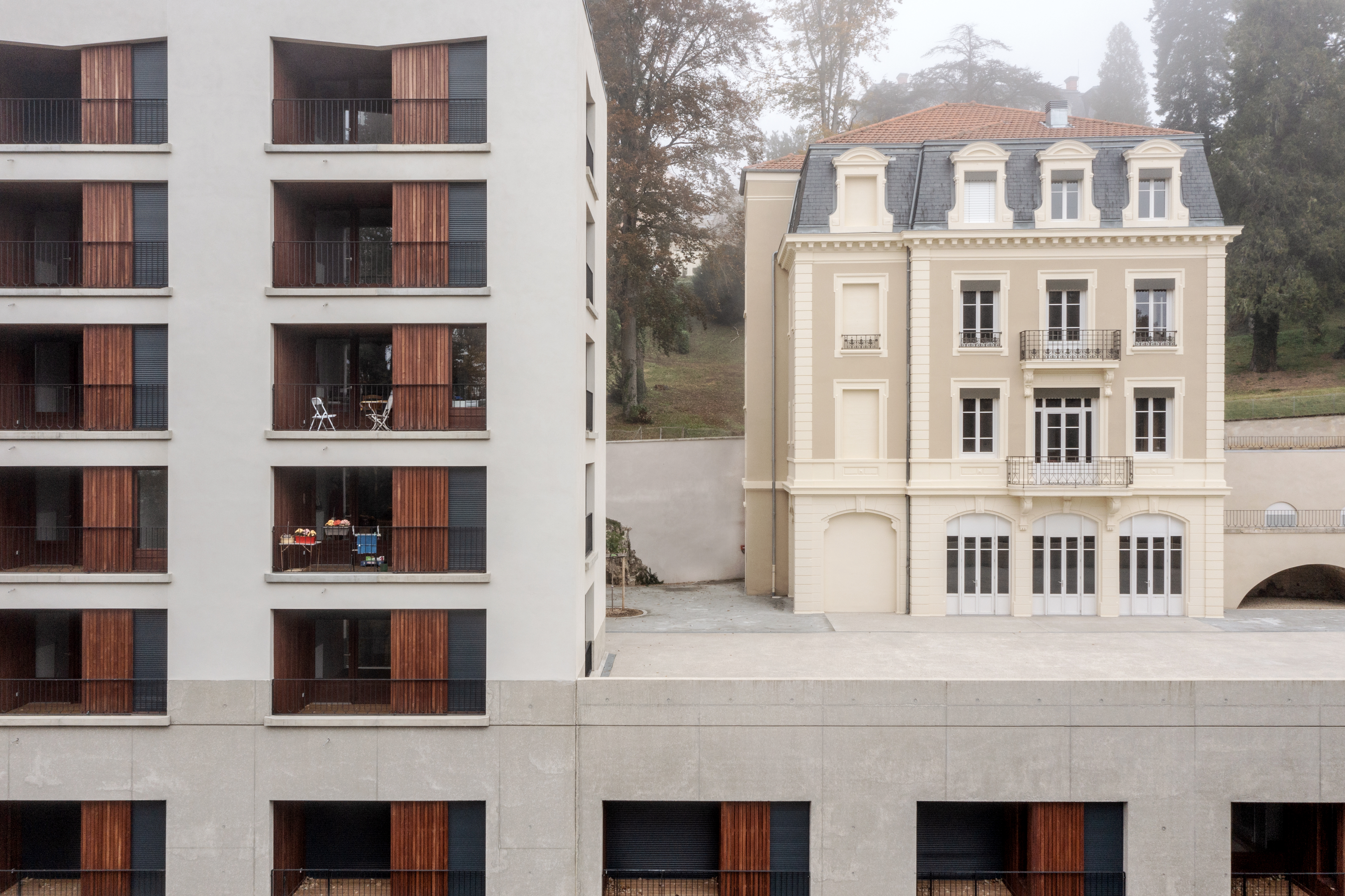 Le projet nait dans ce contexte. La réhabilitation d’une maison de maître de 1880 accueillera une maison médicale, la nouvelle résidence séniors s’y accolera. L’ensemble trouve sa place en haut d’un immense clos, dont l’espace boisé classé, à forte déclivité, offre une vue dégagée sur le grand paysage.